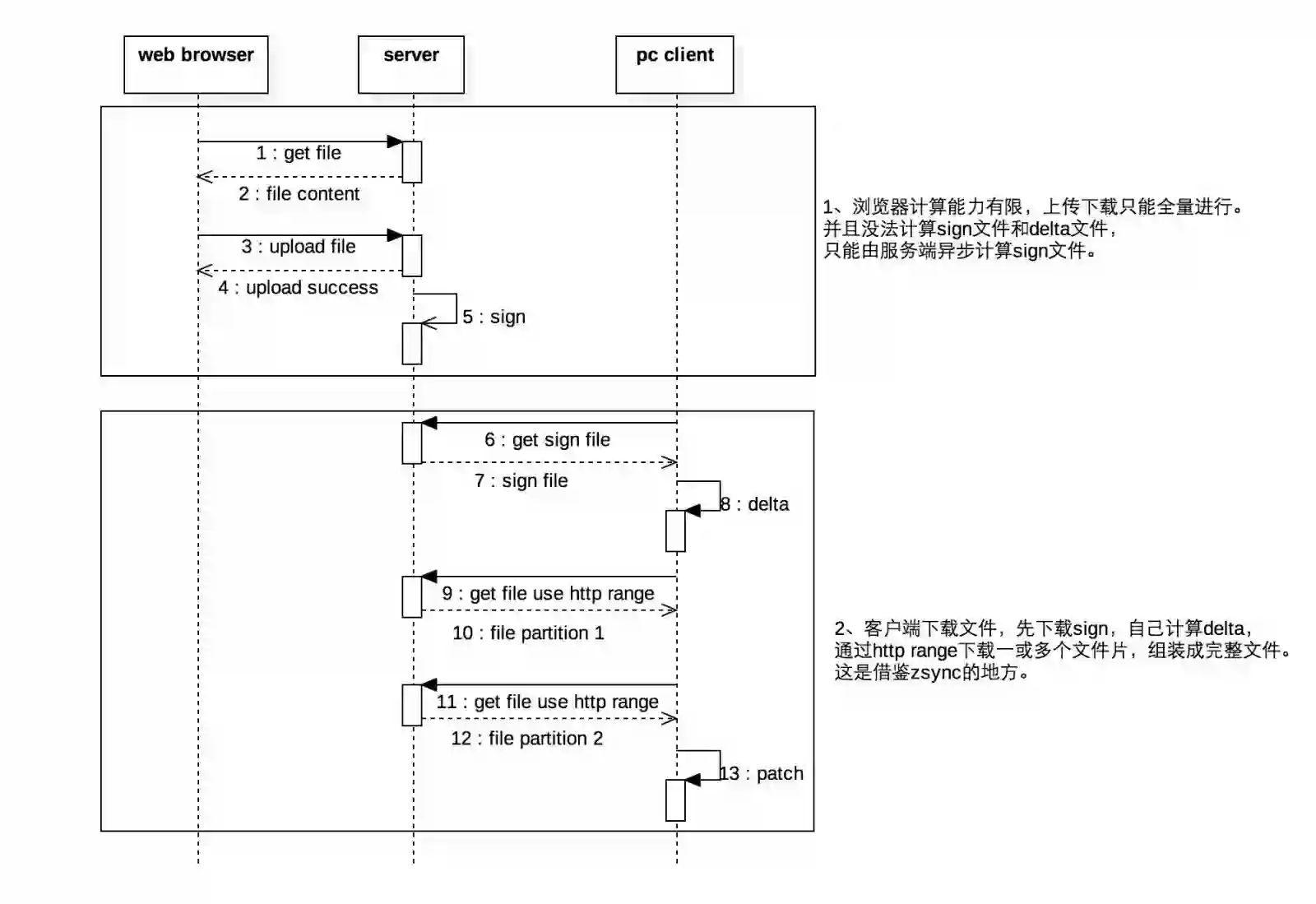 小结:同步的双方A、B基本是对等的,一方计算sign和合并文件,一方计算delta。 双方都有较大计算量,这在一个服务器多客户端场景下,服务端压力会过大。