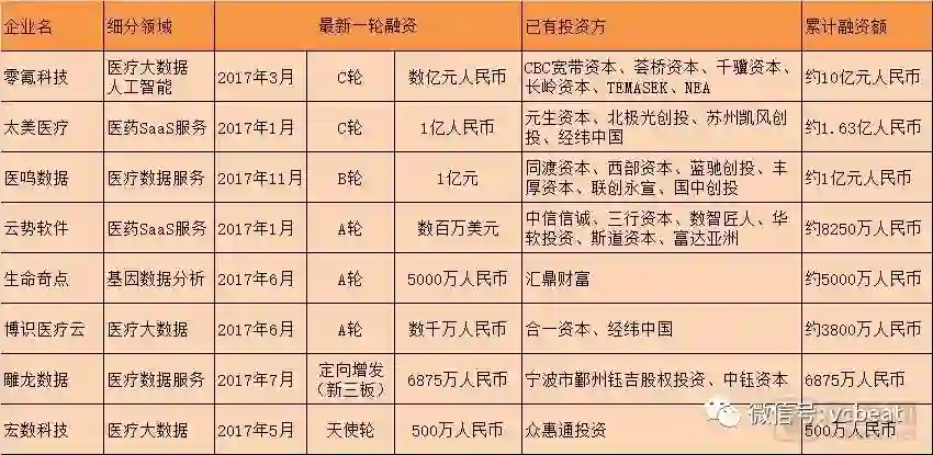 医疗大数据领域的创新公司亦值得关注,投资机构在此领域也跟进活跃。
