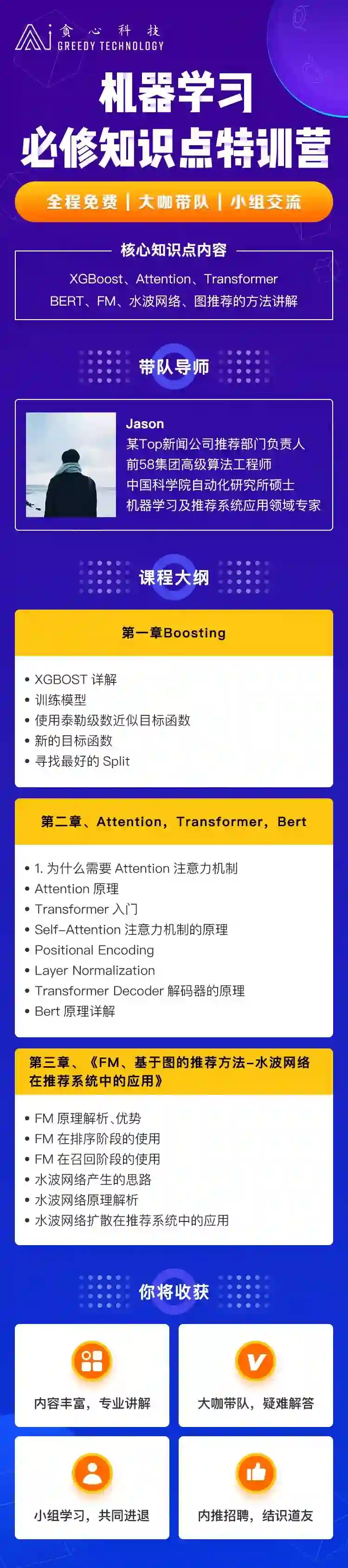 为了帮助大家能够对其有个更深入的理解这些内容,贪心学院特此组织了这次的学习小组计划,深入浅出讲解每个算法模型的每一个技术细节。对于想了解算法底层的朋友们来说,参加这次活动绝对有很大收获! 感兴趣的朋友们可以扫一下下方二维码报名参加,不见不散!
