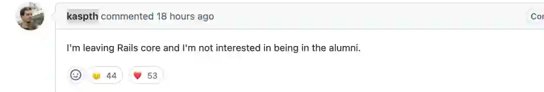 巧合的是,就在这篇文章发布后不久,Javan Makhmali(Rails Committer团队的成员)、Kasper Timm Hansen(Rails核心团队开发者)以及Andrew White纷纷宣布离职。