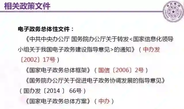 对于电子政务的顶层架构,我们国家出台了一系列的文件,第一个是2002年发布的,这个文件更多的是一个指导意见,相对来讲原则性比较强。那个时候,不管是政府的信息化,还是企业的信息化,还是社会的信息化都处在探索阶段。所以,国家在那个时候能够出台这么一个文件是难能可贵的,对于我们政府信息化起到了非常强的指导性作用。