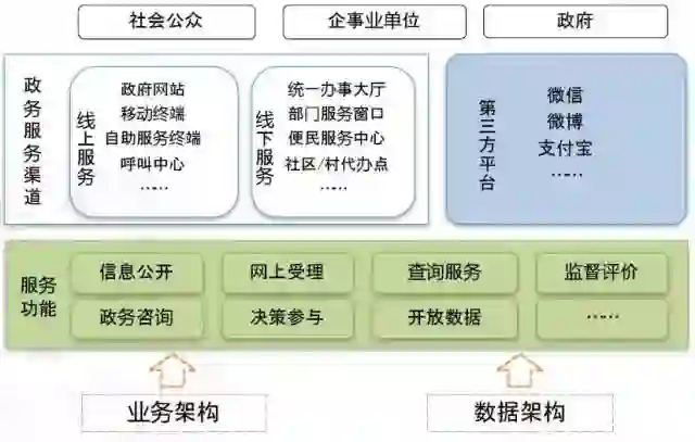 刚才讲的是个数据体系,从服务架构体系来讲,我们服务的功能和以前不太一样,我们既要强调信息公开,还要强调网上办理,强调查询,强调监督评价,这个传统的在原来的2006年框架里面就有。我们放到大数据时代还有很多服务功能,比如政府咨询、发挥智库功能、决策参与、开放数据等等,这些服务必须要布局上来。实现这些服务功能的服务渠道越来越多元化了,既包括传统的政府网站、移动终端、热线服务这种线上的服务,也包括线下的服务,原来有一个误区就是大家老以为搞电子政务就是在网上走,一切都在网上,不在网上就不是电子政务,但是发展到今天你会发现我们很多东西一定是线下的,这种O2O的方式在政府里面同样是存在的。这些体系不管你的业务架构,数据架构,还要支撑线下的服务。虽然你到一个实体的部门来办理,部门办理的背后一定是有网络支撑,不是人工的模式,也不是手工纸质的模式。我们特别强调了这种电子政务系统对统一办事大厅部门服务、便民服务、社区以及村里代卖店的支撑。