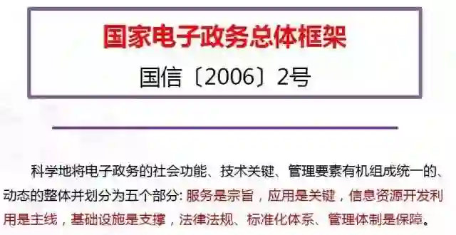 第二个重要文件是在2006年,由国家信息化办公室的国信2号文,这个文件专门对电子政务的总体框架做了一个基本的描述,然后作为国家文件的形式固定下来。