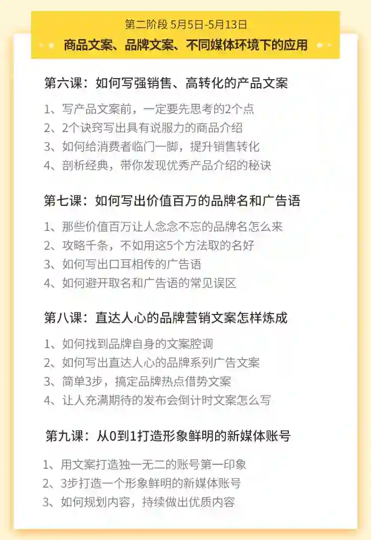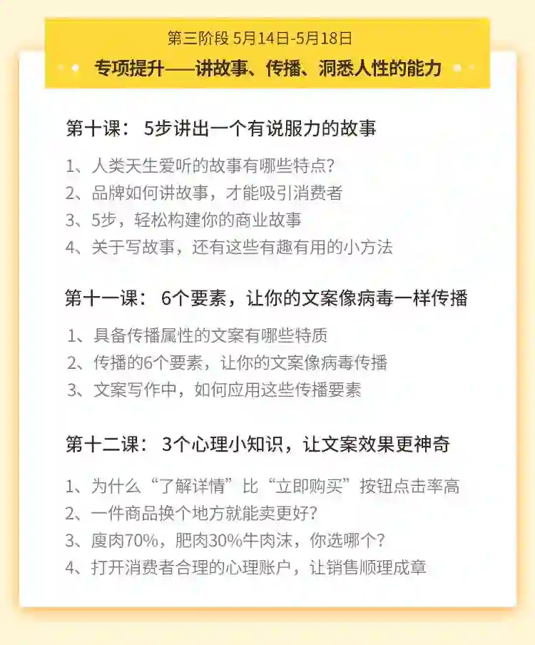 你逐步掌握: 文案的底层逻辑、标题/内容/结尾的写法/、销售文案的写法、品牌文案的写法、文案传播的要素等