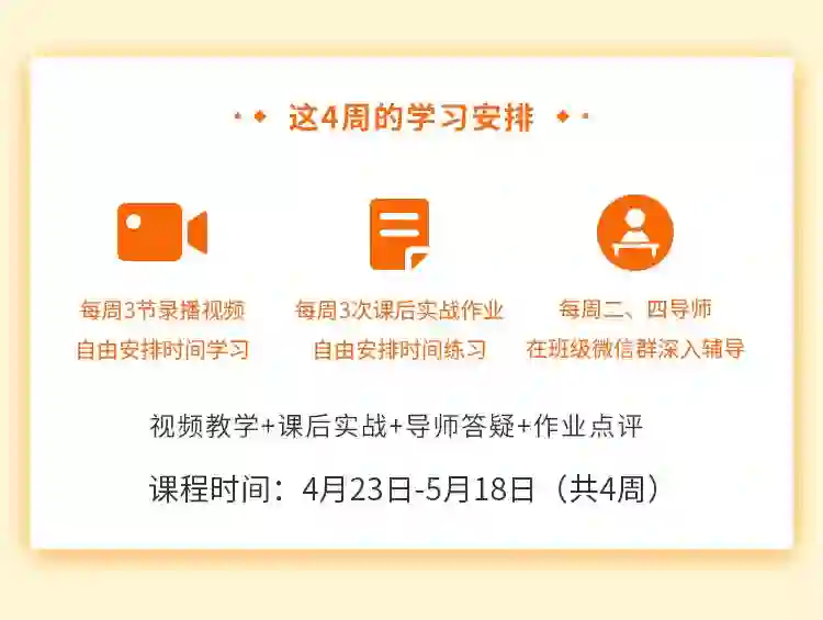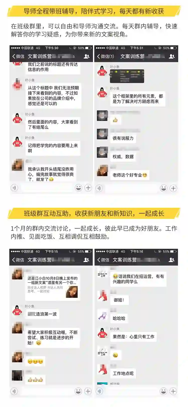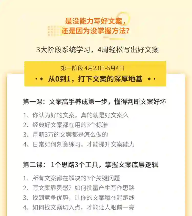 “起点学院&腾讯课堂”联合打造文案训练营,通过4周的系统学习, 11次文案实操,老师的1对1批改和班级群内答疑。