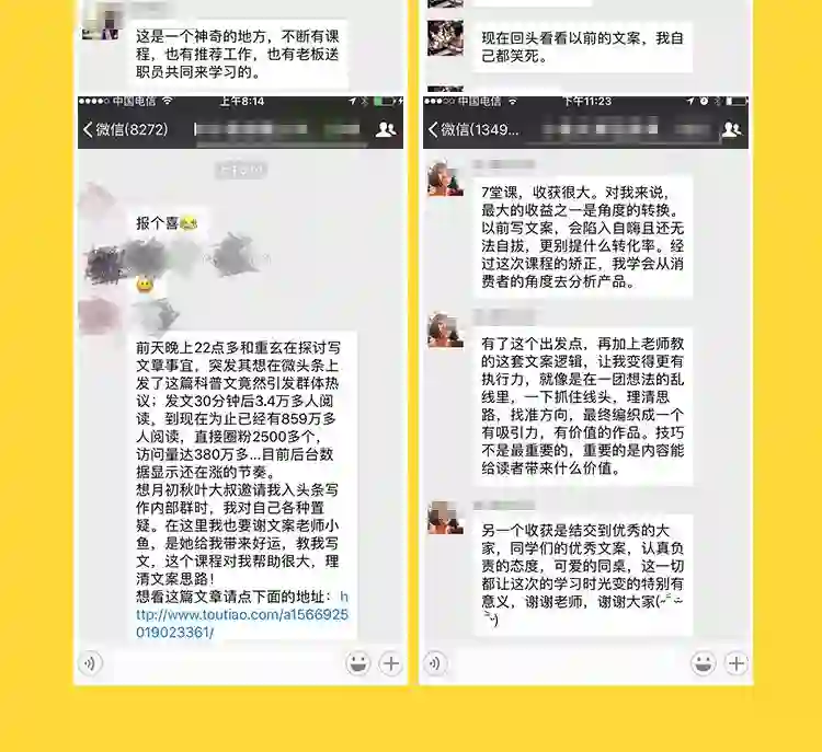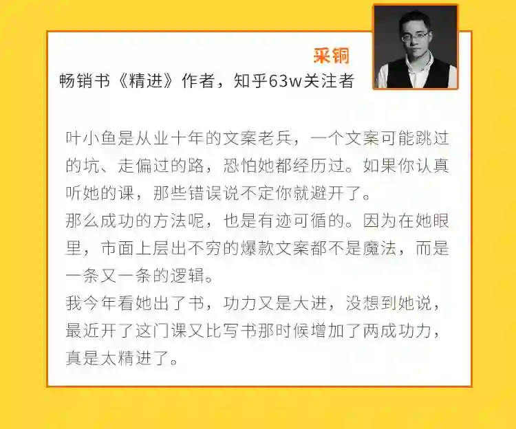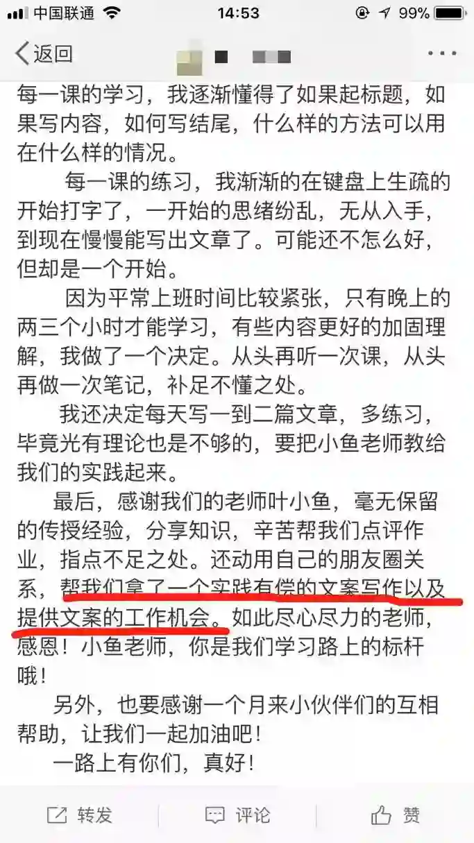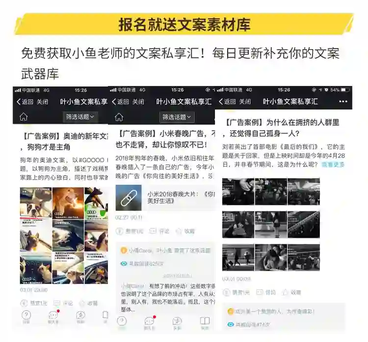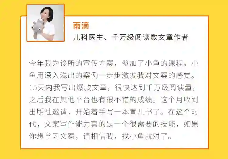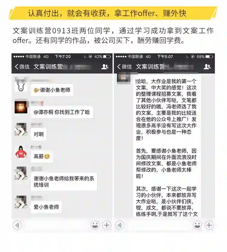 在小鱼老师的用心指导下,有同学通过这个课程,0基础成功转岗文案;有同学靠写文案每月赚零花钱。