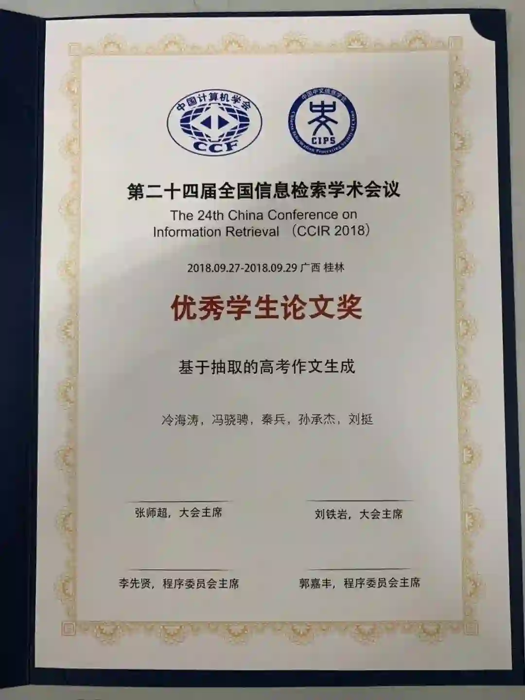 1.冷海涛,冯骁骋,秦兵,孙承杰,刘挺. 基于抽取的高考作文生成. (Oral)