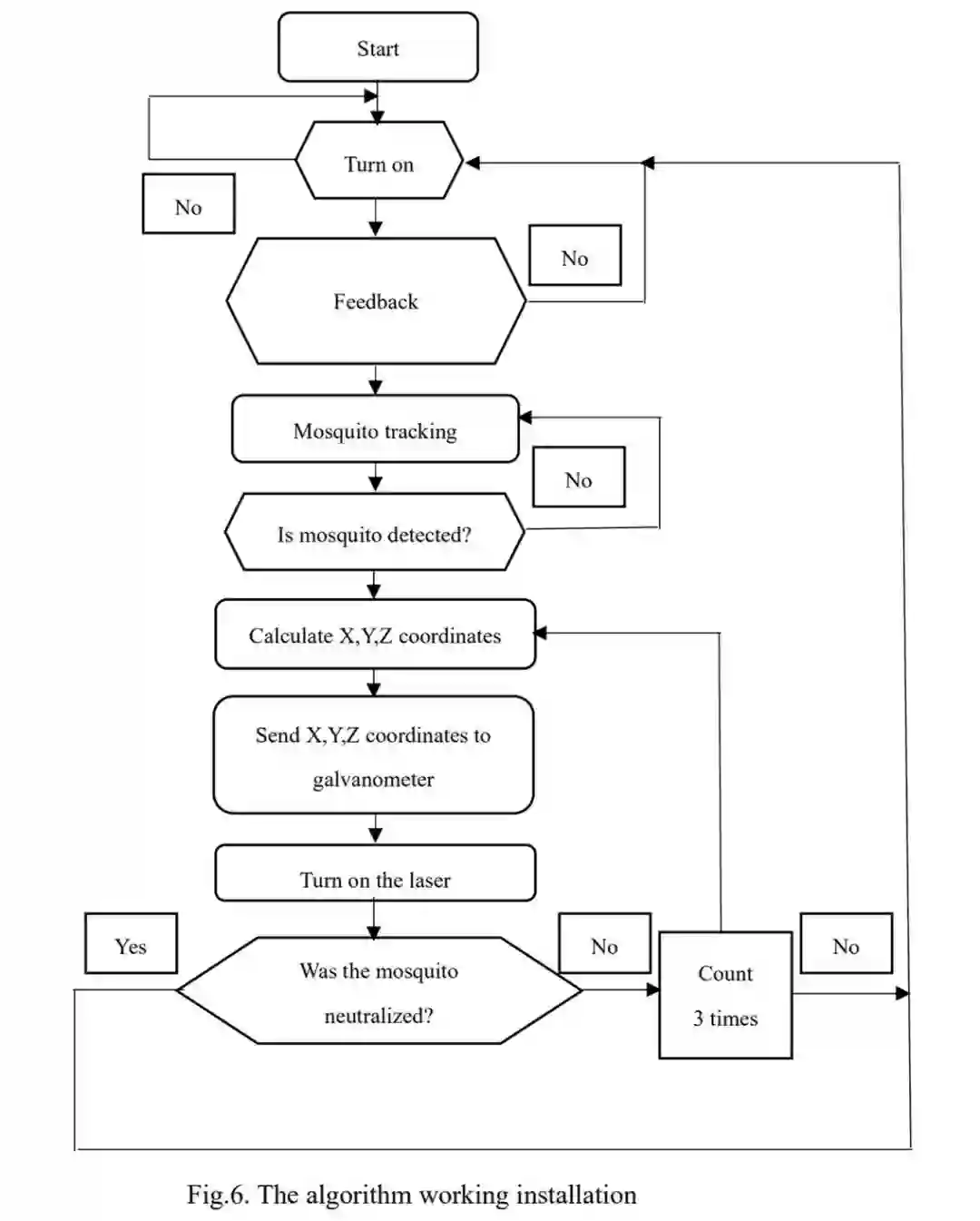 这一激光灭蚊系统的工作流程如下图所示。首先,利用摄像头及系统内置的算法确定蚊子的位置并算出它的坐标,然后将这一坐标传递给电流计。在发射之前,电流计可以借助镜子来改变激光的方向,从而瞄准蚊子。在激光发出之后,如果蚊子被打中,系统将开始新一轮的工作,如果没有,系统将重新计算蚊子的坐标并进行再次打击。考虑到蚊子的运动轨迹比较多变,研究者还分析了影响蚊子飞行的各种因素(比如气味、风速等),并列出了一个预测蚊子轨迹的公式。