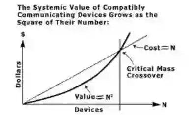他想通过这张简单图清楚地说服客户——买网卡的成本随着时间是线性增长的(N),但网卡构成的网络价值则是呈指数级增长的(N²)。