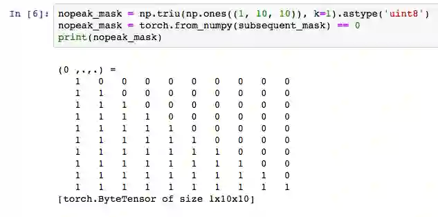 因此,我们需要防止解码器偷看到还没预测的单词。为了达成这个目的,我们用到了nopeak_mask函数: