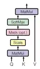 V,K和Q分别代表“key”、“value”和“query”,这些是注意力函数的相关术语,但我不觉得解释这些术语会对理解这个模型有任何帮助。