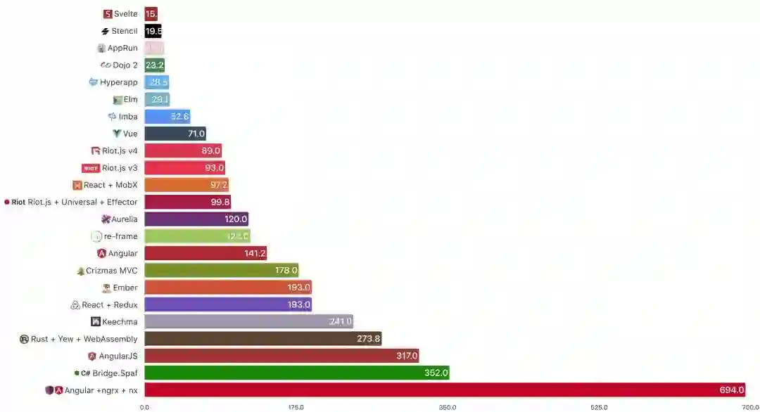 这个指标说明了给定库 / 框架 / 语言的简洁程度。也就是说根据规范,你需要多少行代码才能实现几乎相同的应用(其中一些有更多的花边部分)。