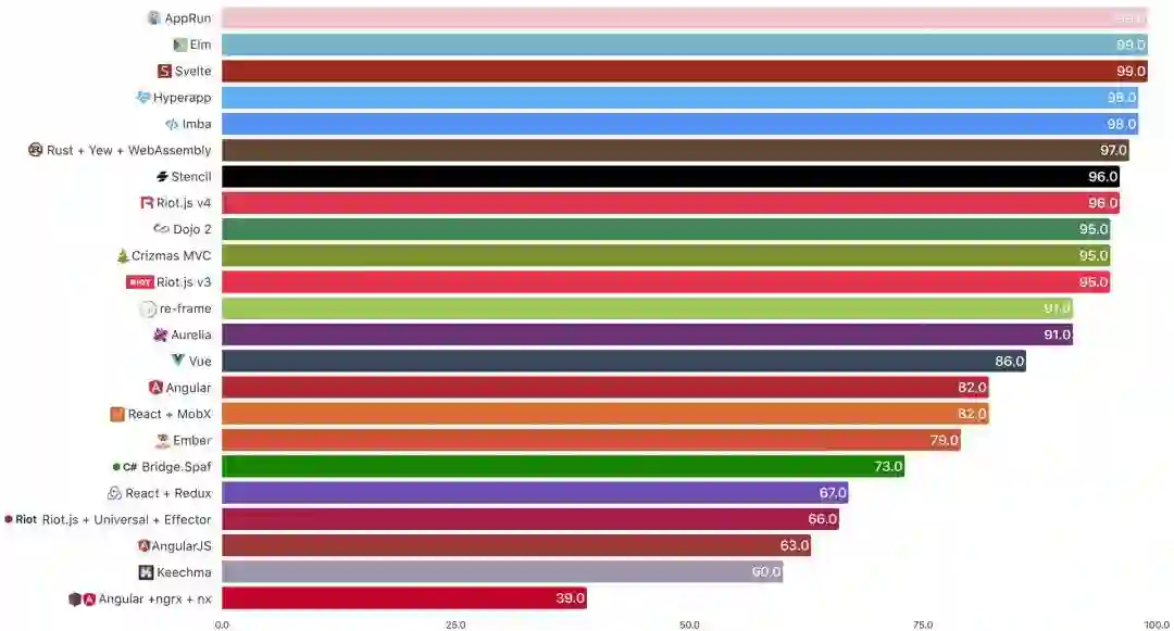 Lighthouse Audit 不会说谎。你可以看到在今年未维护 / 未更新的框架做出来的应用跌破 90 分大关。如果你的应用得分超过 90,表现应该不会有太大区别。具体来说,AppRun、Elm 和 Svelte 确实令人印象深刻。