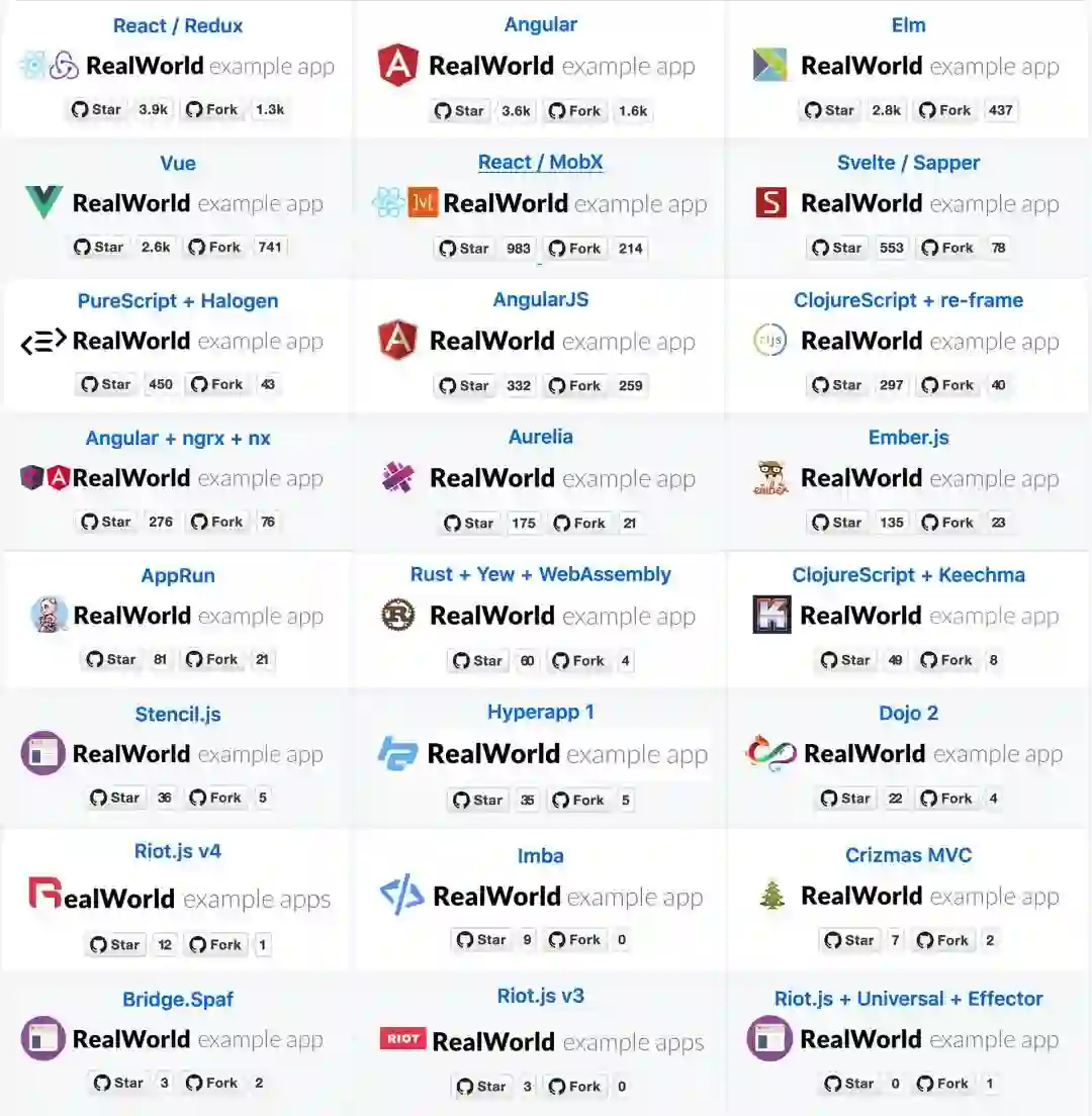 在撰写本文时,在 RealWorld 存储库中有 24 种 Conduit 实现。框架是否流行并不重要。唯一的参评条件是——它出现在 RealWorld 仓库页面上。