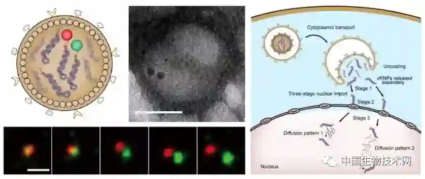 单病毒示踪可以实时动态高时空分辨地揭示病毒侵染的奥秘。流感病毒是对人类威胁最大的病毒之一。之前,Zhuang等曾示踪了单个流感病毒进入细胞的过程。但是,实时示踪病毒进入细胞后的脱壳过程,一直是未能实现的科学难题。最近,中国科学院武汉病毒研究所崔宗强学科组利用量子点特异性标记病毒的基因组和单颗粒示踪技术,实时动态观察到单个流感病毒的脱壳过程,揭示了病毒八节段RNA以单体形式释放到细胞质并进入细胞核及其在细胞核内的动态行为与机制。