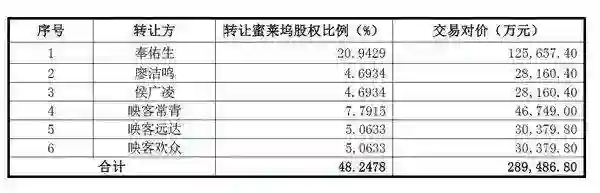 其中,映客创始人奉佑生拟转让所持有的 20.9429% 的股权,套现 12.5 亿元。映客创始团队廖洁鸣和侯广凌分别转让 4.6934% 的股权,交易对价分别为 2.8 亿元。