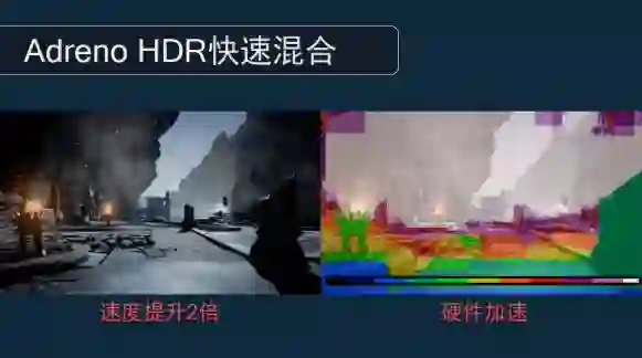 而高通Adreno HDR快速混合的做法,是将画面中固定的部分(右图中彩色的部分)先找出来,再对画面中变动的火焰、烟雾和雪花进行渲染,这可以带来整体渲染速度提升,同时还能降低功耗。