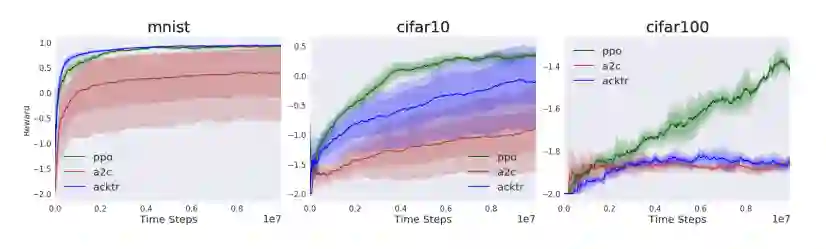 更耐人寻味是,当在3个数据集上从3层CNN到ResNet-18测试时,都可看到性能下降。PPO仍然能够在MNIST和CIFAR10上获得相同的性能,这两个数据集都是10分类任务,但是ACKTR和A2C受到了巨大的影响。没有一个算法在ResNet-18和100分类任务中表现突出。这融合了两个更困难的问题:现在行动空间是10倍大;还要学习10倍多的概念。