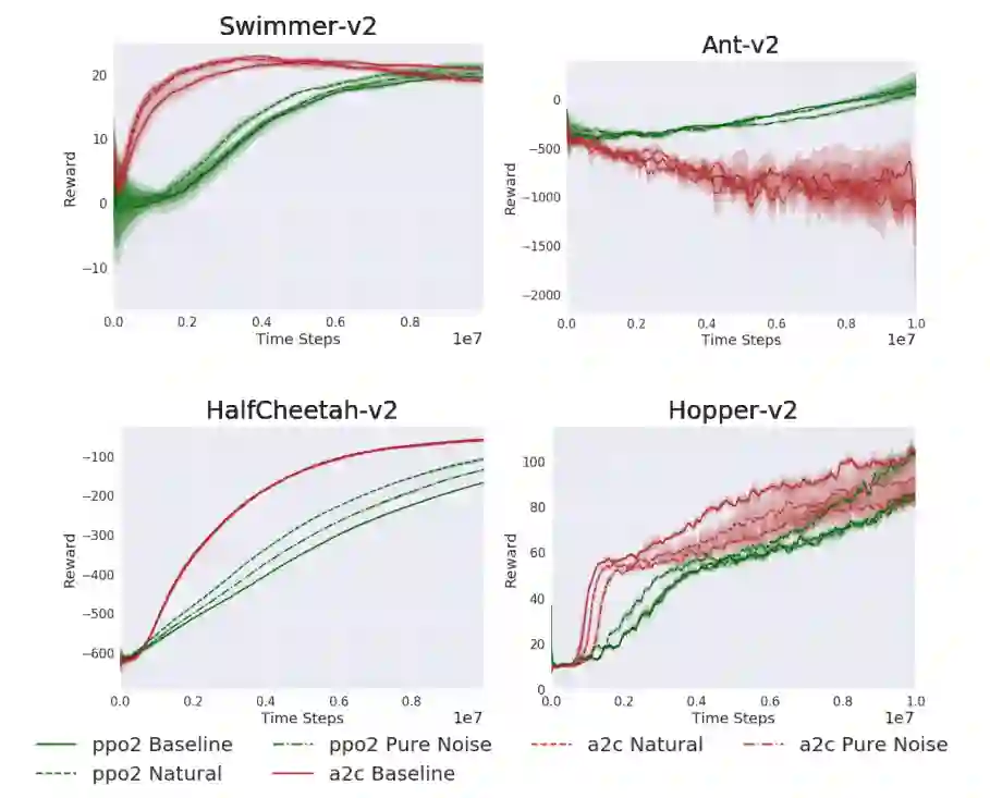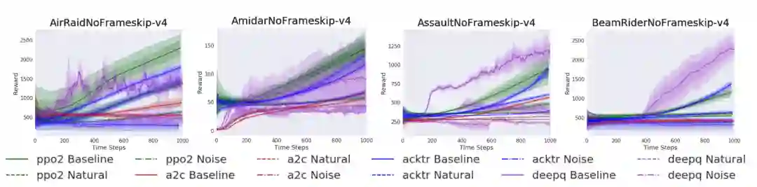 为弄清楚由于自然信号的加入而导致的性能差异有多大,而不是仅仅将环境改变为非确定性,还评估了一些Atari环境,其背景被帧间变化的随机独立同分布高斯噪声所替代(图6)。四款游戏中,智能体在原始静态黑色背景(基线)下的性能最好,类似于高斯噪声下的性能降低,在视频(自然)下的性能最差。但是性能差异有所不同。在中段,ACKTR和PPO在随机噪声下的性能非常接近基线,但在自然信号下性能会大幅下降。在Beamrider中,任何随机噪声或自然信号的加入都令该算法无法获得良好的策略。