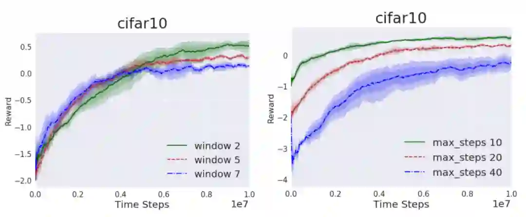 图3 CIFAR10结合PPO算法,(左)固定最大步数M=20,窗口大小变化曲线图;