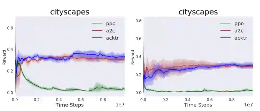 Cityscapes目标检测任务的结果如图4所示,当从3层CNN主干转为ResNet-18时,任务难度加大的同时性能也略有下降。虽然PPO在分类任务中击败了A2C和ACKTR,这里看到PPO已完全丧失学习能力。但是A2C和ACKTR在超过40%的时间内都无法导航到图像中的期望目标。说明深度模型在RL框架和SL框架中的表现确实不同。