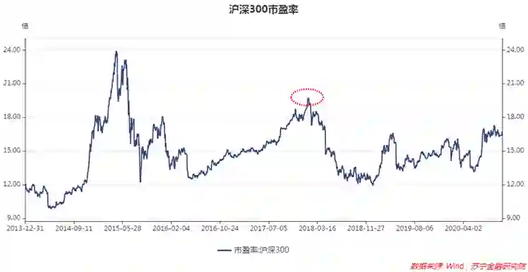 举例来说,2015年牛市之后,市场风格明显转向——以创业板为代表的小盘股持续杀跌,以沪深300为代表的大盘股市盈率逐步抬升。但好景不长,沪深300平均市盈率很快升至19.7倍的阶段性高点(2018年1月24日),与2015年牛市高点水平相差无几,从市场估值的角度看,极易引发恐慌抛售情绪,只能掉头向下了。