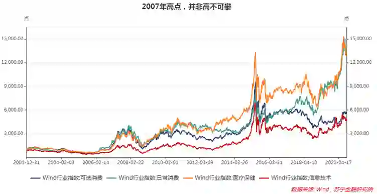 我们仍以行业举例,虽然大盘距离6000点仍有很大差距,但就可选消费、日常消费、医疗保健、信息技术等几个行业来看,当前市场走势早已超越2007年的高点。甚至回头去看,过去任何一个点位买入,长期持有都可以赚钱。