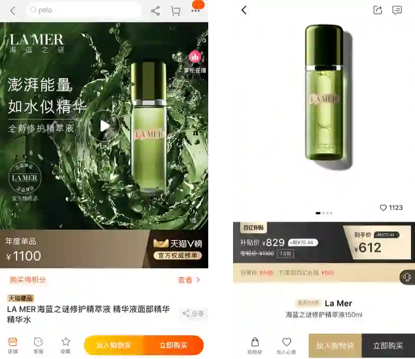 LA MER 海蓝之谜精萃液在天猫(左)与万里目(右)的价格对比