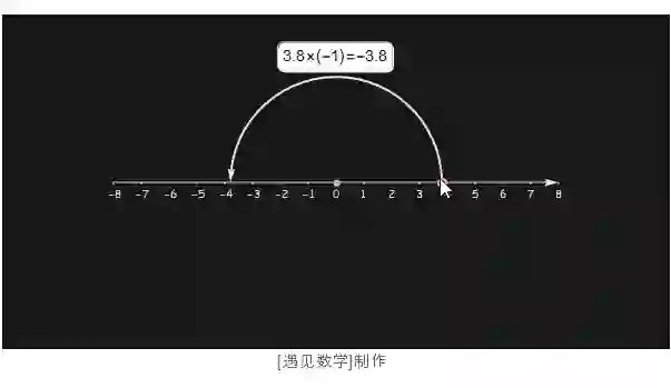再来看下图中, 任何实数乘以 -1 的结果都会落在关于原点对称相应的位置上. 所以乘以 -1 的计算可以理解为该点(数)绕着原点旋转了半圈.