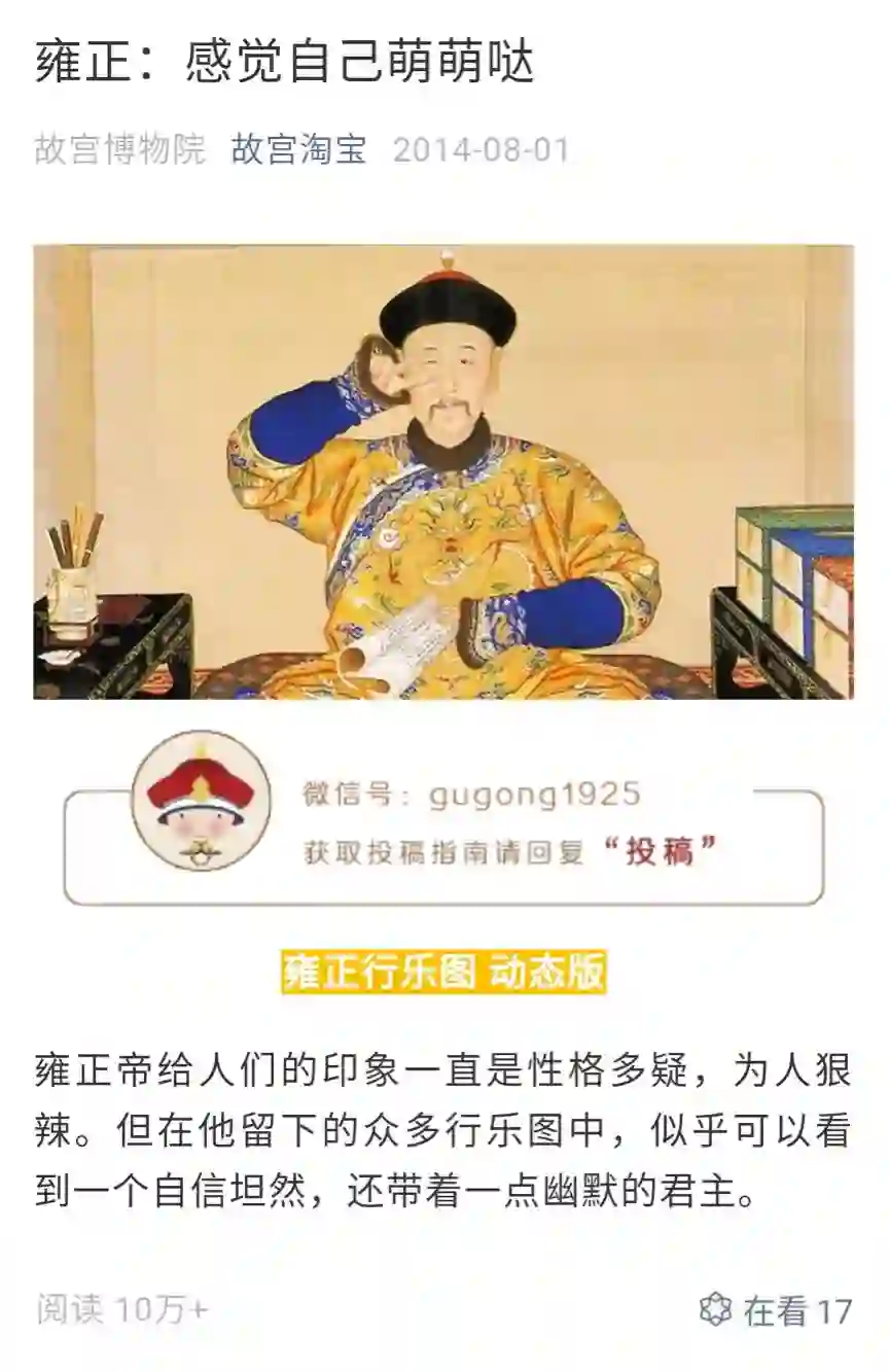 2014年,一篇名为《雍正:感觉自己萌萌哒》的原创文章,让向来平均只有四位数阅读量的故宫第一次达成了10W+的“小目标”。卖萌、“抠脚”、逗猴的雍正与挑眉故作撩人的康熙表情包瞬间风靡全网,萌翻众人。