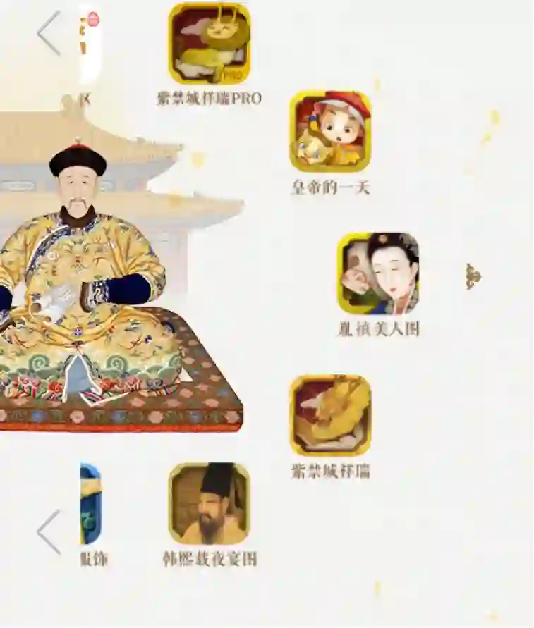 2013年-2014年,故宫率先推出三款趣味App:从十二幅美人屏风画像一窥清朝盛世宫廷生活的《胤禛美人图》、揭秘紫禁城里的祥瑞符号的《紫禁城祥瑞》和游戏类App《皇帝的一天》。其后,又陆续上线《韩熙载夜宴图》、《故宫展览》等共计十款App,且都蝉联AppStore精选榜单。