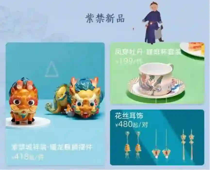 自2015年起,故宫开始产出各种魔性又可爱的周边商品。从Q版御前小侍卫、以孝圣宪皇后钮祜禄氏为原型的水杯到胖萌的故宫御猫摆件等,以御前侍卫手机座为例,一经开卖,一小时内,1500个手机座全部售罄,日成交量1.6万单。