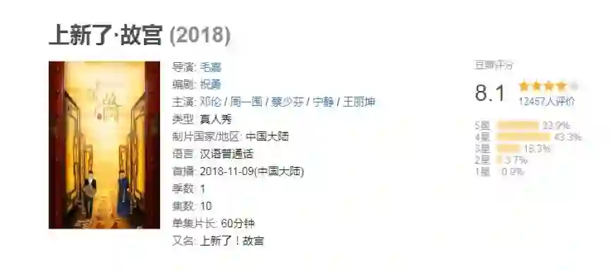 随后,《国家宝藏》和《上新了·故宫》两部真人秀节目的播出,瞬间拉近了公众与故宫的情感距离,豆瓣上分别获得9和8.1的高分。