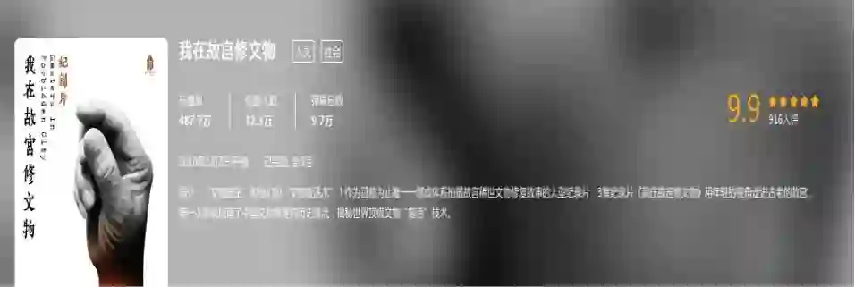 2016年,纪录片《我在故宫修文物》一经播出,便引发了狂热的观看热潮,也让故宫彻底走红。这部仅仅只有三集的纪录片的豆瓣评分和《舌尖上的中国》第一季相同。截至2019年7月15日,该纪录片在B站的播放量高达487.7万。