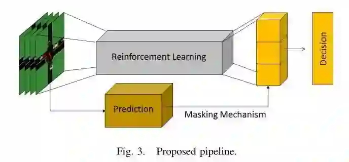 本文工作,提出了一个安全强化学习的框架,使用预测来掩盖不安全的行为。将此方法应用于自动驾驶域,以学习改善无符号交叉口处理性能的策略。