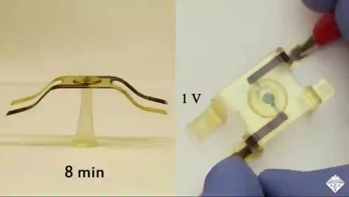 通常来说,印刷电子器件通常是逐层构建的。在原型设计中,研究人员将膨胀材料放置到准确的位置,即顶部或者底部的几层中。在构建各层时,底层轻微地与印刷平台粘在一起,粘性足以保持器件扁平。一旦器件的制造完成时,它会从平台上脱落,且无需任何外界刺激,由新材料制成的关节便开始膨胀,将器件朝着相反的方向弯曲,膨胀力会使它自己折叠成预定的形状。