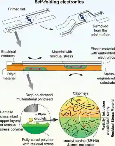 这个机制的核心是一种可用紫外线固化的油墨,它含有高延伸率的丙烯酸酯低聚物和短链单体(例如丙烯酸异辛酯)。作为逐层喷墨打印的3D打印技术的一部分,每一次之前的固化(轻度交叉结合)层,厚度约 17 μm ,会与相邻层未固化的油墨相接触。油墨中的小分子让下面的固化层发生膨胀,产生一个局部的残余应力。图片底部的圆形特写显示:残余应力材料在固化之前和之后的情况;刚性材料与应力的生成机制无关。用于直接写入内部残余应力的材料与刚性的、紫外线固化的丙烯酸酯相互结合,通过控制材料的放置与位置,产生出所需角度的凹凸褶皱。弹性导体所连接的有源电子器件,都在同一系统中印刷。