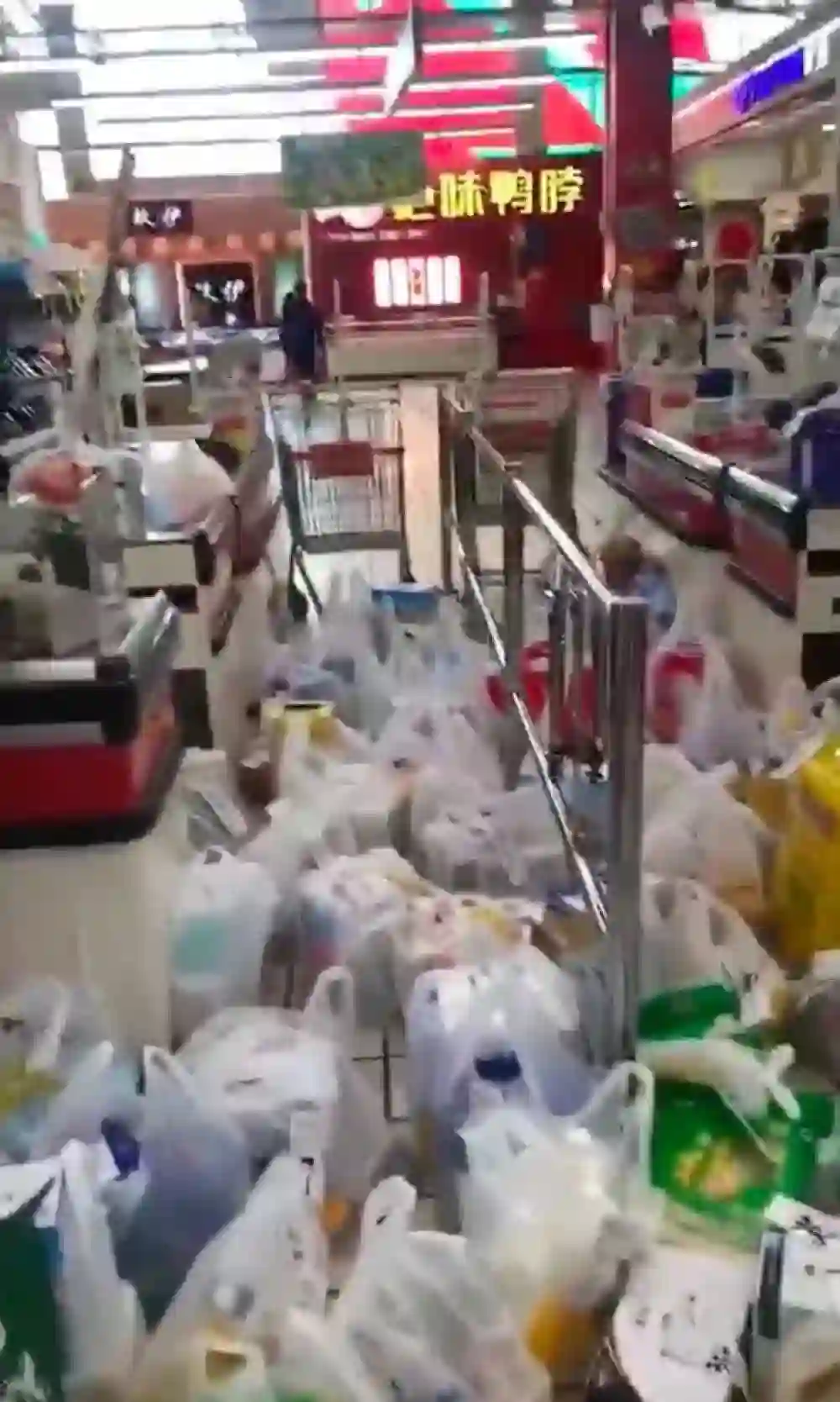 豆瓣小组上有用户晒出超市被搬空的图片,各种商品被打包好堆满了收银台前的过道。社交网络上不断有无锡的用户发出几块钱的外卖订单截图,引发评论里一阵阵赞叹。