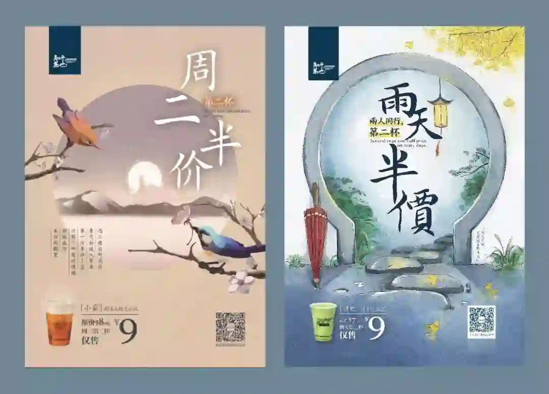 从今天起之后的每个雨天,第二杯清欢清爽版(静冈抹茶搭配纯牛奶)只要9元;每个周二,第二杯小蛮淡奶芝士版(碳焙花香乌龙)也只要9元了。