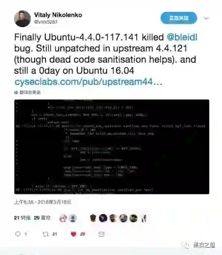 Twitter 上 Nikolenko 发推表示 Ubuntu 最新版本存在一个本地提权漏洞,攻击者通过该漏洞可以直接获取 root 权限。该漏洞(CVE-2017-16995)早在老版本中已经完成修复,但是在 Ubuntu 16.04 版本中依旧可以被利用。