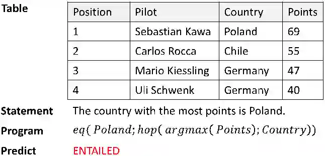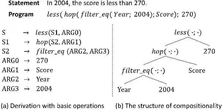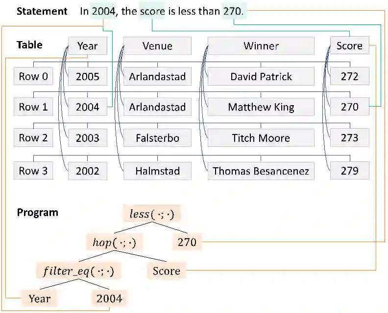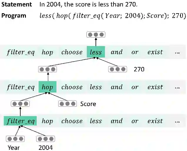 我们提出了一个在神经网络中建模逻辑操作的方法: Logical Fact Checker,方法主要分为四个步骤。首先,给定一个表格和声明,使用语义解析器(Semantic Parser)去生成一个可在表格上执行的程序,该程序由预先定义好的逻辑操作组成。下图给出一个程序生成的例子。
