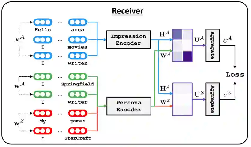 Transmitter 采用的是 GPT 架构(Radford et al. 2018),它以当前说话者的个性、整个对话的历史作为输入,逐步解码生成回复。Receiver 则被设计来准确衡量两个人的对话中有多少信息是与个性相关。然而,训练数据中并没有这样的监督信息,为此,我们采用对比学习范式来训练 Receiver。具体而言,每次随机采样一个干扰(distractor)个性,Receiver 需要学习到当前对话与干扰项的关联度远低于与当前个性的关联度。