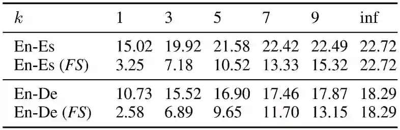 表1:SimulSpeech 在不同 k 下的 BLEU 分数比较。FS 代表使用整句训练(即不使用 wait-k 策略)的模型