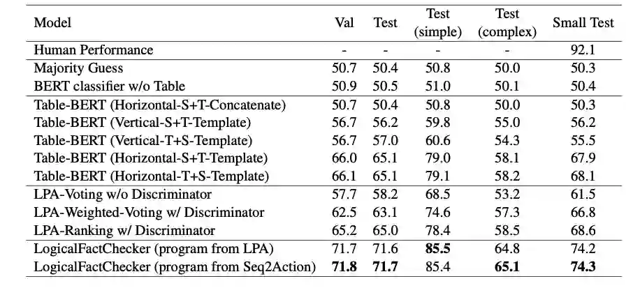 论文在基于表格的事实检测的代表性数据集 TABFACT 上进行实验。可以看出,该方法超越了基于文本匹配的模型 Table-BERT, 也超过了基于语义解析的模型 LPA,并取得了最好的性能。