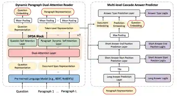 如图14所示,RikiNet 模型由两部分组成:(1)动态的段落双重注意力阅读器(Dynamic Paragraph Dual-attention Reader, DPDA reader),通过利用一系列互补的注意力机制和预训练语言模型对文档和问句进行编码,以得到上下文相关的问句表示,token-level 和 paragraph-level 的文档表示;(2)多层级的级联答案预测器(Multi-level Cascaded Answer Predictor,MCAP),利用 DPDR 输出的多层级表示,以级联的结构依次预测长答案、短答案和答案类型。