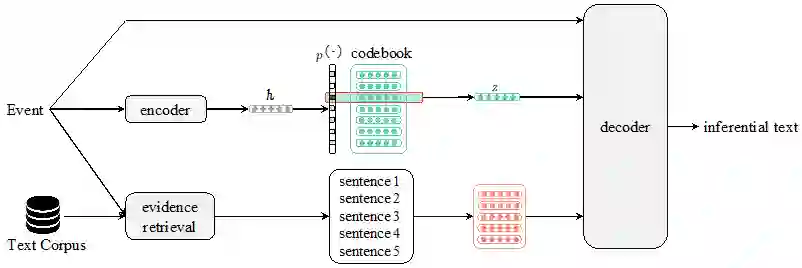 在本文中,我们提出了一种面向证据的推理文本生成的方法(EA-VQ-VAE),从语料库中自动寻找有用的背景知识,用来帮助模型的生成。整体框架上图所示。给定一个事件 Event,首先通过量子变分自编码器(VQ-VAE)得到具有语义信息的离散潜变量 z,然后从一个大规模的语料库中寻找包含事件和该事件上下文的证据。最后解码器利用具有该事件语义信息的潜变量 z 选择语义相关的证据作为背景知识,从而指导推理文本的生成。