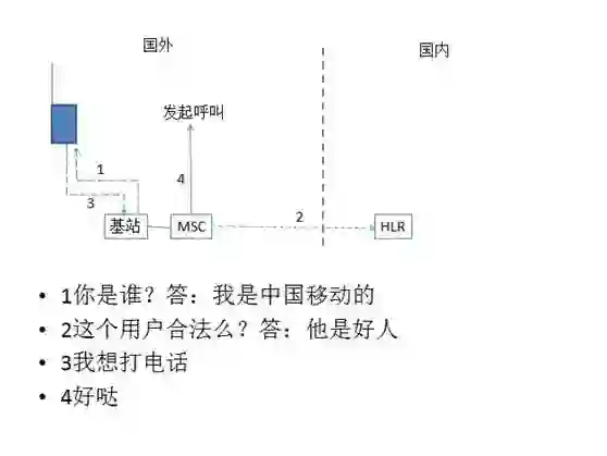 第一步说的是用户的位置更新。国际漫游用户首次在拜访地开机时,手机自动向拜访地网络发起位置更新请求,不需要用户有任何动作,漫游客户就对拜访地的运营商say hello啦。