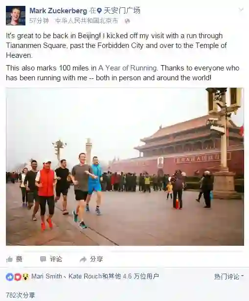 星期五(2016年3月18日)上午,小扎在Facebook上发了条信息,地理位置是天安门广场,配的图片是他在天安门城楼前跑步。