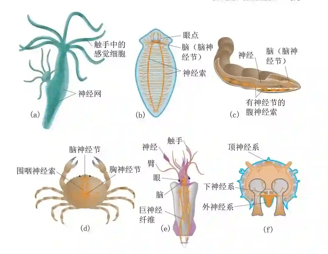 在动物界,神经系统经历了从无到有、从简单到复杂的演化过程,是多细胞动物的身体结构日益大型化和复杂化的产物。大约于5.5-6.0亿年之前,在蠕虫状动物中首次出现了神经组织。水螅(一种刺胞动物)的神经网(nerve net)代表了一种最简单的神经组织(图1a)。图1b显示了一种真涡虫的脑和成对的神经索,这里神经系统首次分化出周围神经系统和中枢神经系统。图1c显示了蚯蚓(一种环节的蠕虫)的脑、腹神经索、神经节和外周神经。图1d显示了一种甲壳动物的主神经节和内脏结缔神经,这是最原始的甲壳动物,有类似于扁形动物的神经系统。但一些头足类(如鱿鱼)有脑(图1e),其行为如同鱼一般复杂。图1f是海星腕的横断面,从外神经系的神经终止于下神经系的表面,但两个系统没有接触。