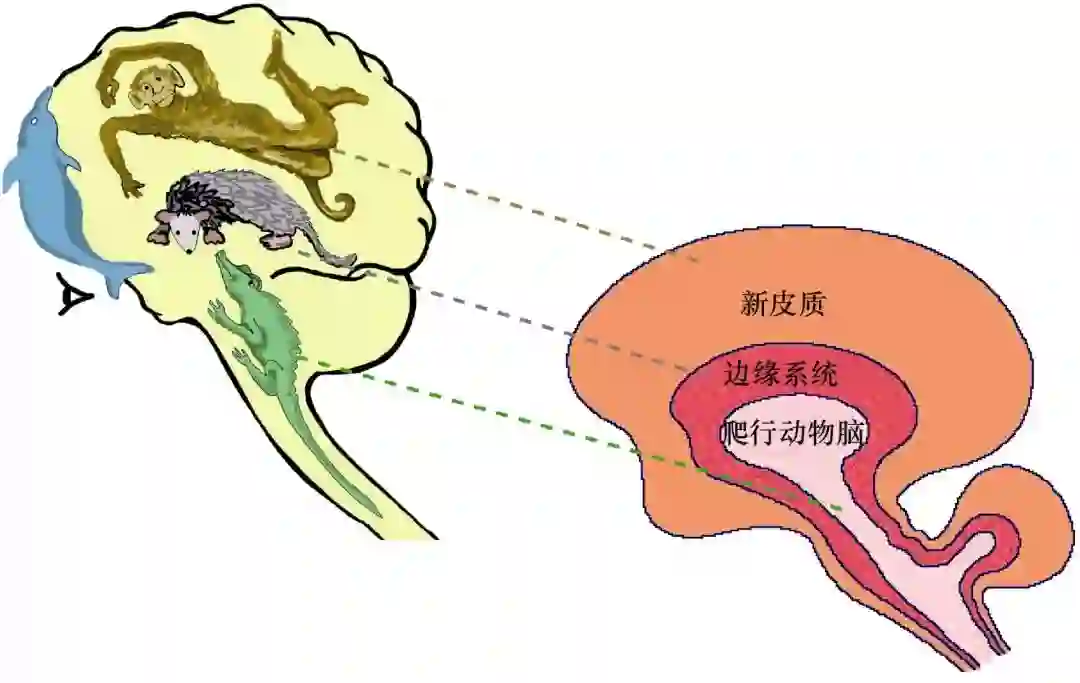 20世纪60年代,美国神经生物学家麦克里恩(Paul D. MacLean, 1913 – 2007)提出了三位一体的大脑进化理论(MacLean's evolutionary triune brain theory),认为人类由留有进化痕迹的三个大脑(图4)——爬行动物脑(reptilian complex)、边缘系统(limbic system)和新皮质(neocortex)复合而成(MacLean 1990),这三个大脑作为不同进化阶段的产物,依次叠加在已有的大脑层之上,如同考古遗址一样(王邈2013)。